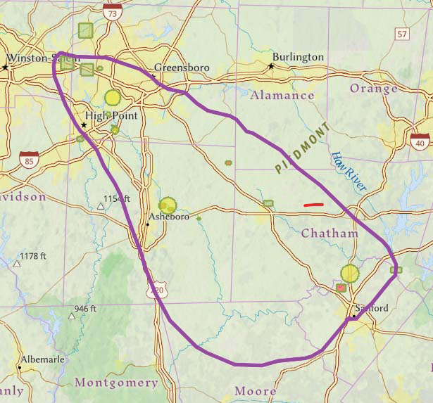 Most of Deep River’s 125 miles are through Randolph County, where seven mill towns were formed along its banks to take advantage of its water power. The river then snakes through Moore and Chatham counties before joining with the Haw River in Lee County to form the Cape Fear River, the longest river in North Carolina.