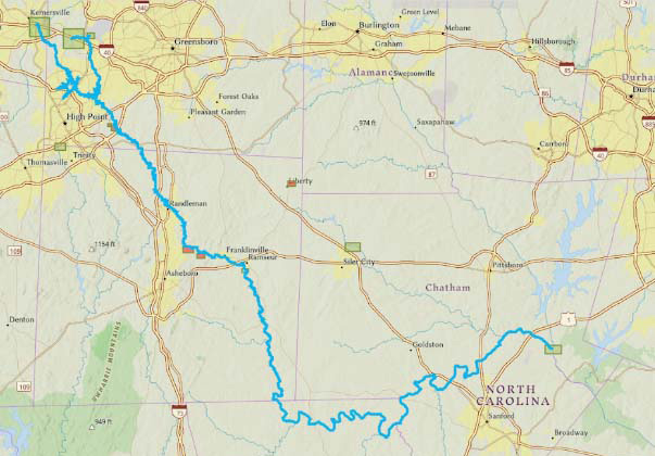 Then it moves into Randolph County, where the 3,000-acre Randleman Reservoir impounds much of the river’s water for treatment and use by the Piedmont Triad Regional Water Authority (PTRWA).