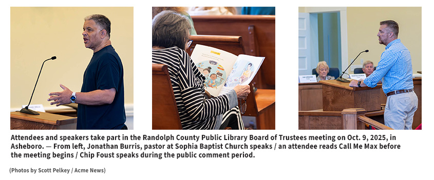 More than one hundred people filled the Historic Courthouse in Asheboro for the Oct. 9 meeting, which included more than an hour of public comments from nearly 30 speakers. The session marked the final step in the library’s reconsideration process following a formal challenge.