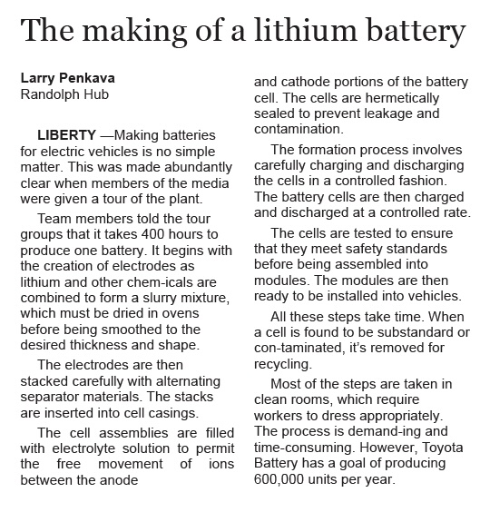 LIBERTY — A new manufacturing plant doesn’t often create a huge celebration. But in this case, it was Toyota observing the start of producing lithium ion batteries for electrified vehicles.