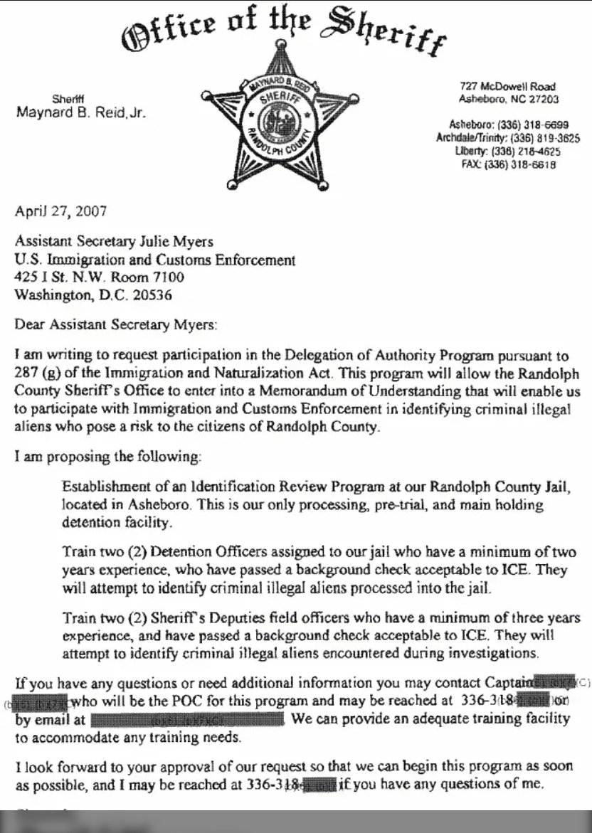 The Randolph County Sheriff’s Office first expressed interest in joining the 287(g) program on April 27, 2007, when then-Sheriff Maynard B. Reid, Jr. sent a letter to U.S. Immigration and Customs Enforcement in Washington, D.C. The letter proposed creating an Identification Review Program at the county jail in Asheboro and training a small group of detention officers and deputies to help ICE identify inmates who might be in the country illegally.