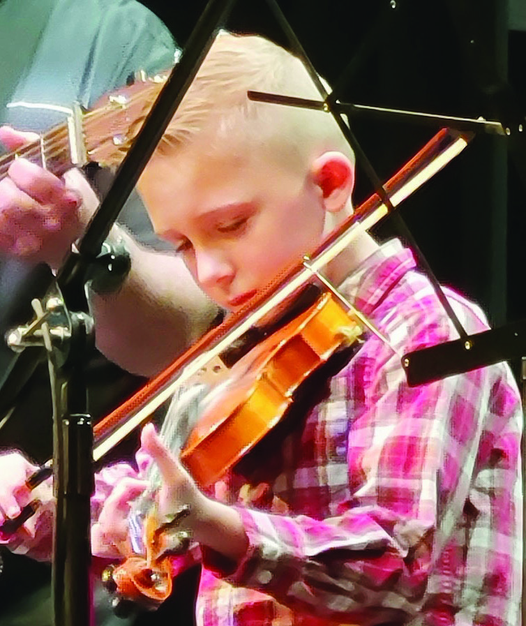 Then 12-year-old Austin Goins took the stage to fiddle a couple of hymns. Next came the McGaugh twin sisters, Tynleigh, first on guitar, then Taylor followed on piano. Each performed two numbers on their respective instruments. They were followed by 6-year-old Jabe Harmon on fiddle who sawed away on two hymns.