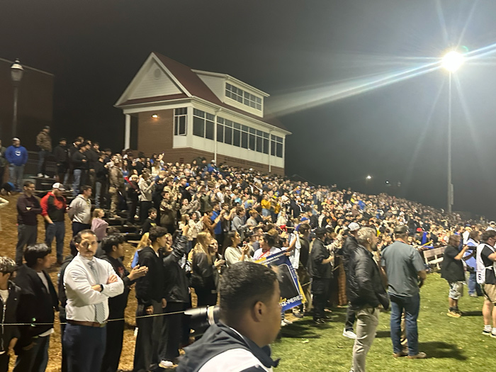 Southwestern Randolph players rush to celebrate with their fans after capturing the 4-A state title Friday night at Guilford College in Greensboro. (Eric Abernethy / Randolph Hub)