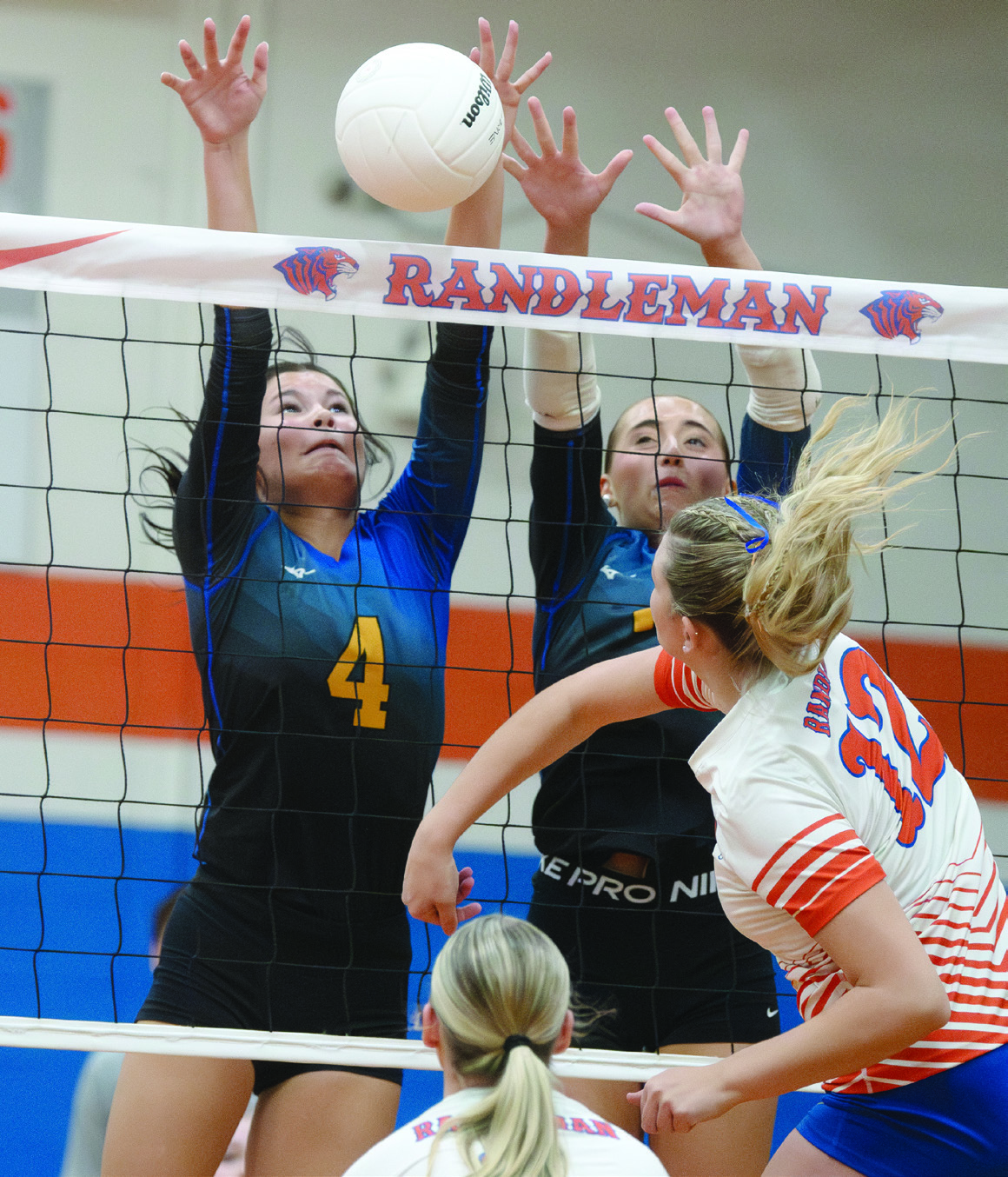 Southwestern Randolph defenders block a return as the Cougars got off to a fast start with a first-set victory. But RHS adjusted and won the next three sets. (Photo: Eric Abernathy / Randolph Hub)