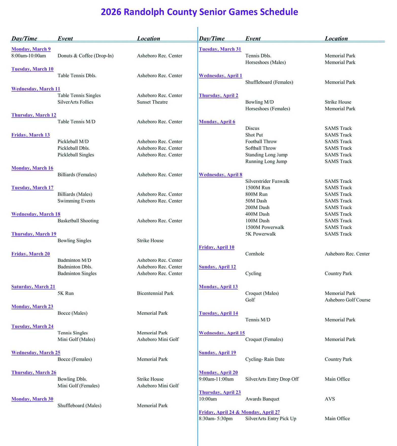 Applications may be completed online at ncseniorgames.org, or a paper application may be requested and mailed. Completed applications with payment must be submitted online or returned to the Asheboro Cultural & Recreation Services Office by Feb. 22. Registration fees are $12 for online registration and $15 for paper registration. Additional venue fees may apply for certain activities.