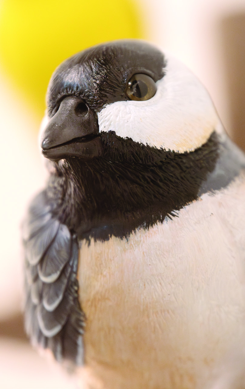 Here is a mixed media from gourd, clay and acrylics on cedar wood titled ‘Black-capped Chickadee’ by Cara Bevan.