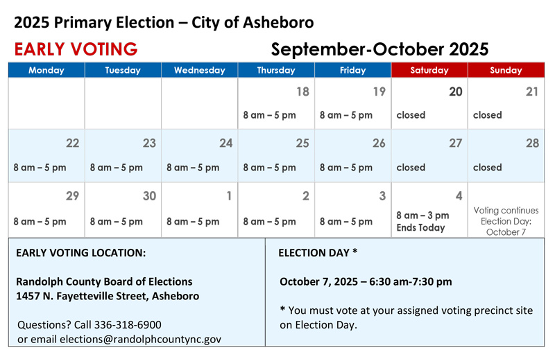 The only early voting location is at the Randolph County Board of Elections office, 1457 N. Fayetteville Street, Asheboro.