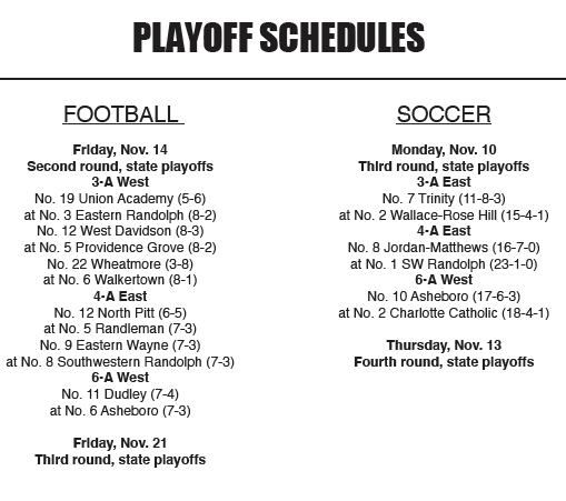 Read MoreWith teams having wrapped up volleyball season, attention turned to the soccer playoffs, where a handful of teams competed. Asheboro, the No. 1 seed in the West in 3-A, began with a pair of wins, including a one-goal nail-biter.